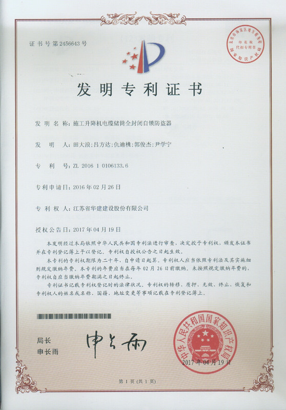 我公司又獲得一項國家發(fā)明專利授權(quán) 時間:2017-06-02 3945 日前,公司又一項發(fā)明專利獲得國家知識產(chǎn)權(quán)局授權(quán),此項專利名稱為“施工升降機電纜儲筒全封閉自鎖防盜器”,專利號為ZL 2016 1 0106133.6。 至此,公司已有22項發(fā)明專利入賬。