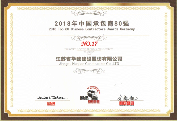 11月8日,由美國《工程新聞記錄》(簡稱ENR)和中國《建筑時報》主辦的2018年“中國承包商80強和工程設(shè)計企業(yè)60強”排名正式揭曉,江蘇華建再次入選中國承包商80強榜單,列第17位。