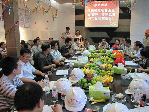 住建部建筑施工安全專項督查組檢查指導廣西麗原•天際城項目 時間:2010-10-14 5171 9月18日上午,國家住房城鄉建設部建筑施工安全專項督查組蒞臨我公司廣西麗原·天際城工地檢查指導工作,勘察了施工現場的實體安全狀況,查閱了施工質量安全技術資料,檢查了我公司的資質、安全許可、三類人員與特種作業人員持證的情況。項目部的安全防護與文明施工工作受到了督查組的一致好評,住建部工程質量安全監管司王樹平副司長在知道我們爭創“魯班獎”的情況后,提出了許多寶貴的意見,并預祝我們的質量目標得以圓滿實現。 另訊,此前麗原·天際城工程項目被評為2010年上半年廣西自治區文明工地。