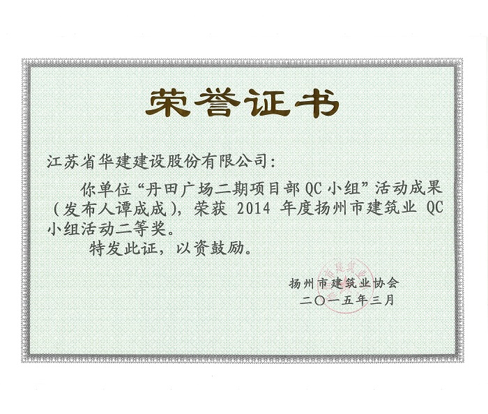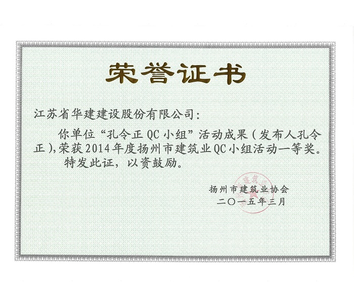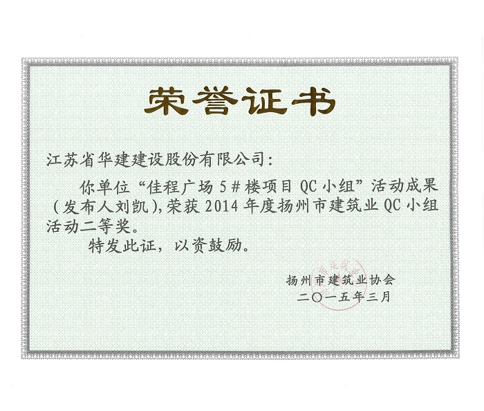 公司5項成果獲揚州市建筑業QC成果獎 時間:2015-03-31 4794 近日,揚州市建筑業協會發文表彰了2015年度全市建筑業QC小組活動成果獎,公司共有5項成果獲獎,其中,“孔令正QC小組”活動成果《剝蝕丘陵地貌多形截面鋼筋混凝土灌注樁施工新方法》榮獲一等獎,“佳程廣場5#樓項目QC小組”活動成果《提高核心筒筒體結構施工質量》、“重慶佳程廣場項目部QC小組”活動成果《提高現澆混凝土樓梯結構施工質量》、“丹田廣場二期項目部QC小組”活動成果《提高蒸壓加氣混凝土砌塊外墻合格率》榮獲二等獎,“馬賽公館項目部QC小組”活動成果《 提高耐磨金剛砂地面施工質量》榮獲三等獎。