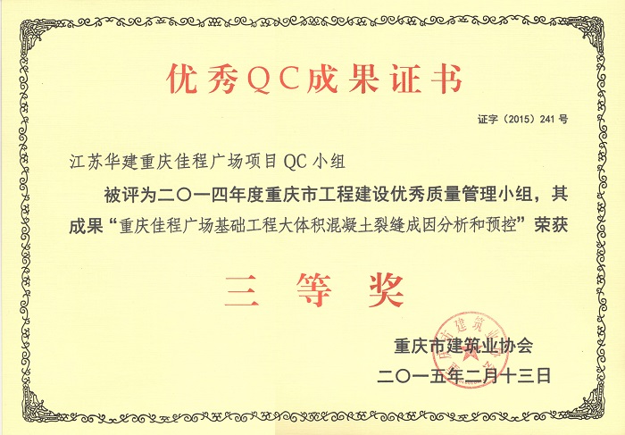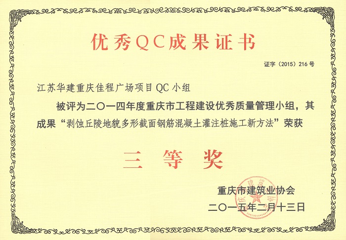 公司3項QC成果榮獲重慶市三等獎 時間:2015-04-02 4672 近日,重慶市建筑業協會發文表彰了一批優秀QC成果,公司重慶佳程廣場項目QC小組被評為2014年度重慶市工程建設優秀質量管理小組,其成果“提高箱型內設隔板式鋼柱內混凝土密實度”、“剝蝕丘陵地貌多形截面鋼筋混凝土灌注樁施工新方法”、“重慶佳程廣場基礎工程大體積混凝土裂縫成因分析和預控”等均榮獲三等獎。
