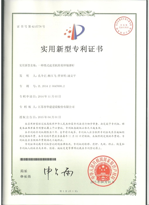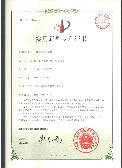三項實用新型成果分別是:1、《一種預留洞用模具》(專利號:ZL201420647560.1,專利權人:孔令正、嚴正濤、楊玉飛、郭冬冬);2、《一種型鋼混凝土的模板支撐結(jié)構(gòu)》(專利號:ZL201420647633.7,專利權人:孔令正、楊玉飛、曹亞明、郭冬冬);3、《一種塔式起重機附著伸縮撐桿》(專利號:ZL201420647600.2,專利權人:孔令正、楊玉飛、曹亞明、湯文平)。