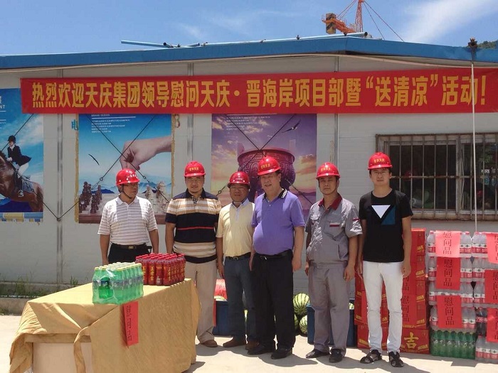 千里送清涼——天慶集團董事長韓慶慰問我司一線職工 時間:2015-08-05 4107 8月4日中午,烈日當空,驕陽似火。甘肅天慶房地產集團有限公司董事長韓慶一行不遠千里來到廣東珠海,頂著烈日,冒著酷暑,在項目負責人陳建的陪同下,慰問我司承建的“天慶·晉海岸”項目一線施工人員,給工人們送來了西瓜、礦泉水、王老吉等飲品和深情問候,讓廣大一線職工在炎炎烈日下感受到陣陣清涼。