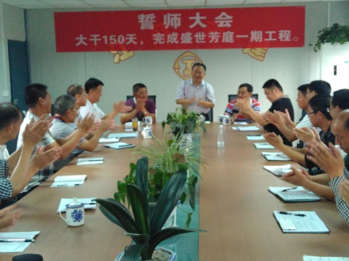 8月31日下午,盛世芳庭項目部在工地會議室舉行“大干150天誓師大會”,江蘇華建常務副總經理、總工程師程杰、珠海區域公司總經理繆國樞、副總經理嚴正濤、江蘇揚安集團董事長李幼杰及項目部管理人員參加會議。
