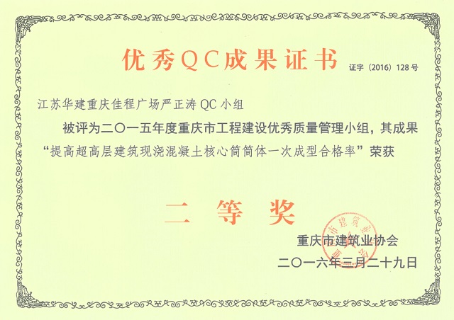 公司新增2項省級QC成果 時間:2016-04-06 4130 近日,重慶市建筑業協會發文表彰了一批優秀QC成果,公司重慶佳程廣場項目嚴正濤、沈正祥QC小組被評為2015年度重慶市工程建設優秀質量管理小組,其成果“提高超高層建筑現澆混凝土核心筒筒體一次成型合格率”、“提高鋼筋機械套筒連接合格率”等均榮獲二等獎。