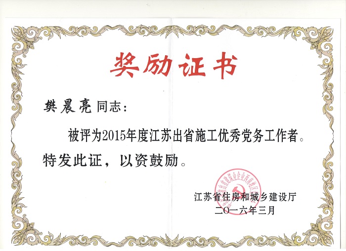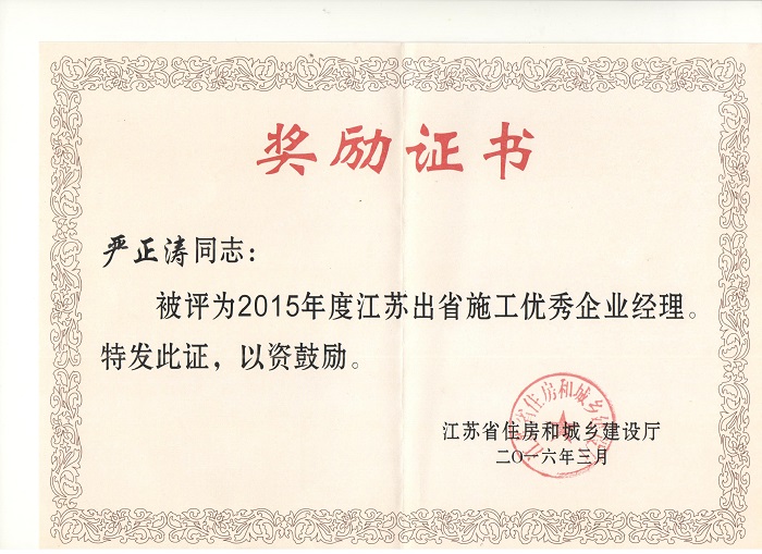 重慶分公司被表彰為“2015年度江蘇出省施工先進(jìn)企業(yè)” 時(shí)間:2016-04-20 2956 近日,重慶分公司被江蘇省住房和城鄉(xiāng)建設(shè)廳表彰為“2015年度江蘇出省施工先進(jìn)企業(yè)”,重慶分公司總經(jīng)理嚴(yán)正濤榮獲“2015年度江蘇出省施工優(yōu)秀企業(yè)經(jīng)理”稱號(hào),樊晨亮被評(píng)為“2015年度出省施工優(yōu)秀黨務(wù)工作者”。