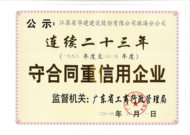 公司連續二十三年被廣東省工商行政管理局表彰為“守合同重信用企業“ 時間:2016-07-21 2887 近日,珠海公司被廣東省工商行政管理局授予“連續二十三年守合同重信用企業”榮譽稱號。 連續二十三年獲得“守合同重信用企業”的榮譽稱號,是政府主管部門和行業的認可和鼓勵,這份榮譽將鞭策珠海公司將誠實守信、合法經營的企業理念一如既往地灌輸到每一個工程建設中去,持續做好企業誠信體系建設,保持自身競爭優勢,樹立守法履約的良好施工企業形象。 目前,珠海公司評選的國家級守合同重信用企業正在公示。
