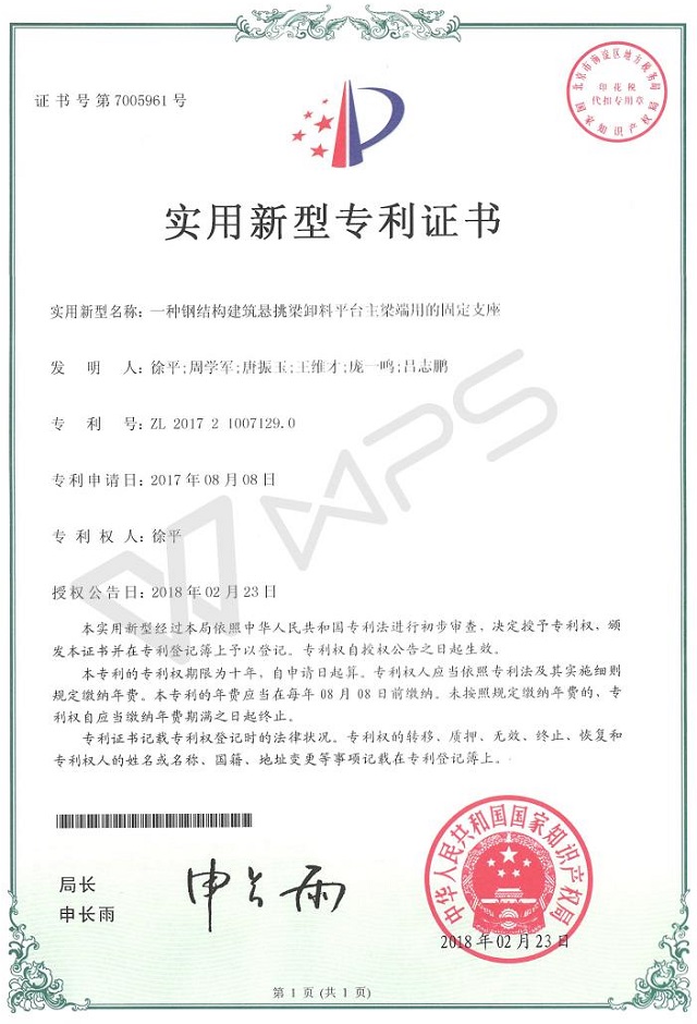 公司新獲一項國家實用新型專利授權 時間:2018-03-09 2805 近日,從國家知識產權局傳來喜訊,公司申請的《一種鋼結構建筑懸挑梁卸料平臺主梁端用的固定支座》獲得實用新新型專利授權。 該專利取材于公司標桿項目華策國際大廈,在建筑鋼結構懸挑梁卸料平臺主梁端固定支座的安裝施工中,技術人員創造性地設計了一種結構簡單、便于拆裝且無需對建筑進行安裝預處理的固定支座。該支座能夠配合現有的較為先進的建筑方式,大幅提高施工效率,并降低安裝、拆卸過程中的安全風險。