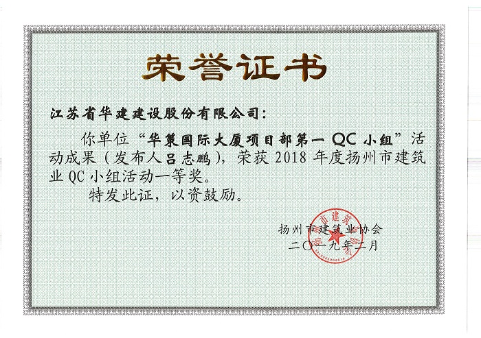 近期,揚州市建筑行業協會公布了2018年度揚州市工程建筑業優秀QC小組活動成果評比結果,公司共有9項成果受到表彰。其中,華策國際大廈項目部QC小組“設備機房減振降噪的創新方法”成果榮獲一等獎;華策國際大廈項目部QC小組“提高鋼結構工程高強螺栓安裝合格率”、威麗詩花園一期QC小組“降低地下室主體結構滲水率”和再生時代項目部QC小組“提高超高層空間鋼柱安裝精度”三篇成果榮獲二等獎;華策國際大廈項目部QC小組“提高輕質隔墻板施工質量”及“提高超高層外包薄壁鋼板混凝土組合剪力墻安裝精度”、再生時代項目部QC小組“提高綠色施工驗收管理評價工作質量”三篇成果榮獲三等獎;威麗詩花園二期QC小組“提高混凝土外觀質量”和陽光馬德里QC小組“鋁合金模板混凝土表面氣泡控制”兩篇成果榮獲優秀獎。