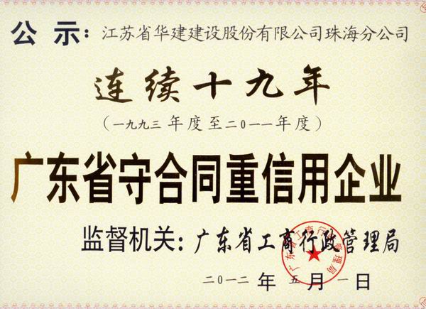公司連續(xù)19年榮獲“廣東省守合同重信用企業(yè)”榮譽(yù)稱號(hào)