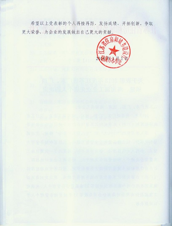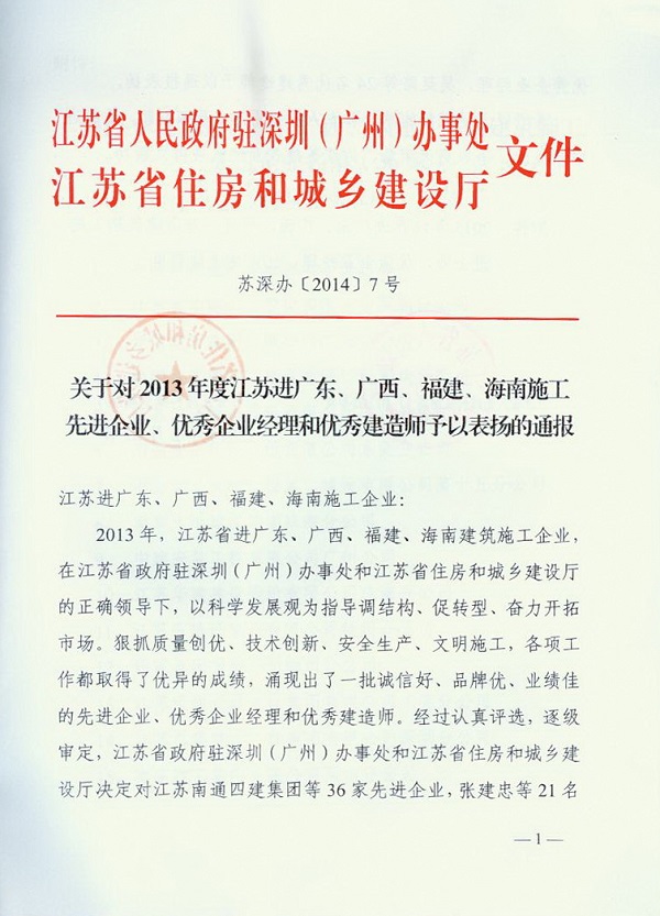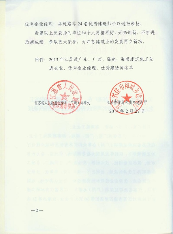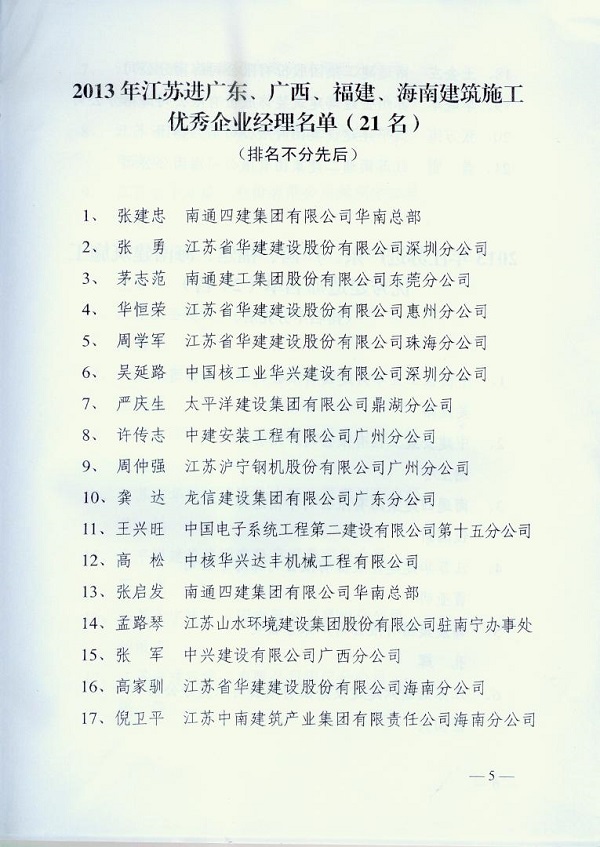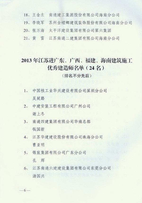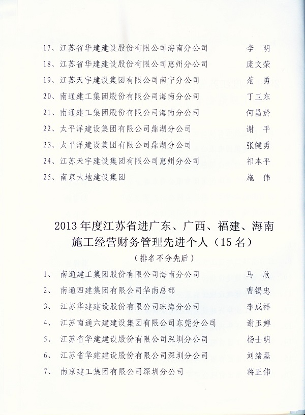 2013年江蘇進粵、桂、閩、瓊建筑施工先進企業(yè)、優(yōu)秀企業(yè)經(jīng)理、優(yōu)秀建造師及經(jīng)營財務(wù)管理、質(zhì)量安全管理先進個人 時間:2014-04-29 3990 0
