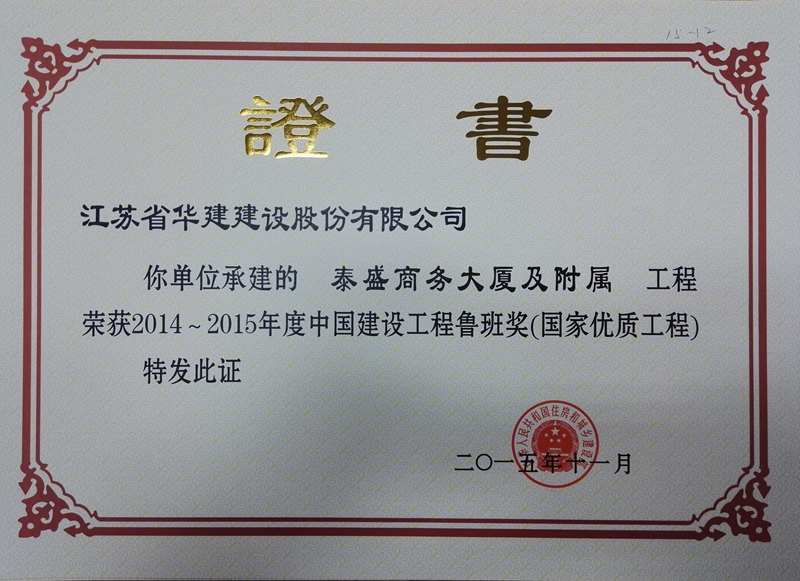 泰盛商務(wù)大廈及附屬工程地處秦皇島市經(jīng)濟(jì)開發(fā)區(qū)核心位置,集商務(wù)辦公、會(huì)議中心、一站式服務(wù)大廳及報(bào)告演藝廳等功能為一體的綜合類商務(wù)辦公樓,地下1層,地上23層,裙樓兩層,建筑面積90148㎡,建筑高度97.75米。工程先后榮獲全國建筑業(yè)綠色施工示范工程、江蘇省新技術(shù)應(yīng)用示范工程、江蘇省省級(jí)工法、河北省結(jié)構(gòu)優(yōu)質(zhì)工程獎(jiǎng)、河北省建設(shè)工程安濟(jì)杯獎(jiǎng)(省優(yōu))、全國優(yōu)秀項(xiàng)目管理成果獎(jiǎng)、全國優(yōu)秀QC小組成果一等獎(jiǎng)。2015年,被中建協(xié)評(píng)為2014-2015年度中國建設(shè)工程魯班獎(jiǎng)(國家優(yōu)質(zhì)工程)。