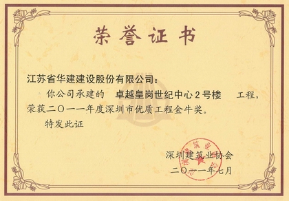 該工程先后被評為深圳市優(yōu)質(zhì)結(jié)構(gòu)工程、深圳市優(yōu)、“金牛獎”、 廣東省建筑業(yè)新技術(shù)應(yīng)用示范工程、全國AAA級安全文明標(biāo)準(zhǔn)化誠信工地、江蘇省省優(yōu)“揚(yáng)子杯”和廣東省優(yōu)良樣板工程。
