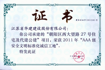 該工程先后榮獲2010年度“北京市文明安全樣板工地”和2011年度全國“AAA級安全文明標準化誠信工地”榮譽稱號。