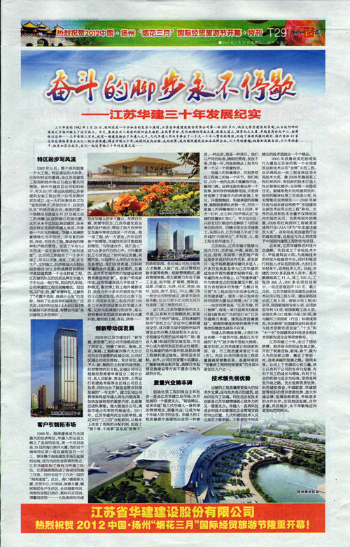 《揚(yáng)州晚報(bào)》專版刊發(fā)公司三十周年宣傳文章 時(shí)間:2012-04-19 5964 4月18日,《揚(yáng)州晚報(bào)》T29版刊發(fā)專版文章《奮斗的腳步永不停歇——江蘇華建三十年發(fā)展紀(jì)實(shí)》,從公司起步、市場(chǎng)開拓、創(chuàng)新發(fā)展、質(zhì)量與科技等各個(gè)層面,介紹了公司三十年的奮斗歷程、綜合實(shí)力和發(fā)展業(yè)績。